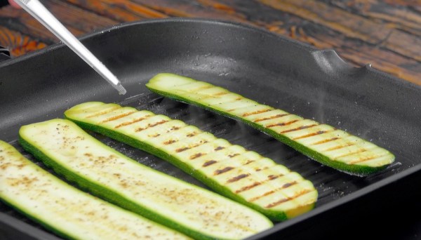 • Coupez les courgettes en longues lanières, salez, poivrez et faites revenir des deux côtés.