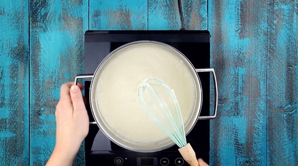 - Pour la semoule, faites bouillir le lait avec le sel, le beurre, le sucre, la vanille et la semoule de blé en remuant constamment. Laissez ensuite bouillir la semoule pendant environ 5 minutes, en veillant à ce que rien ne brûle. Laissez ensuite refroidir brièvement la semoule.