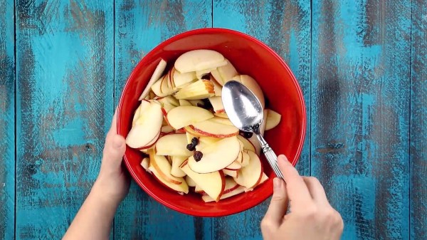 - Lavez et retirez les pépins des pommes puis coupez-les en tranches minces ; réservez une bonne poignée pour plus tard. Mélangez le reste avec le vin blanc, le jus de citron, le sucre et les raisins secs, que vous devez faire tremper brièvement dans de l'eau chaude pour les rendre mous.