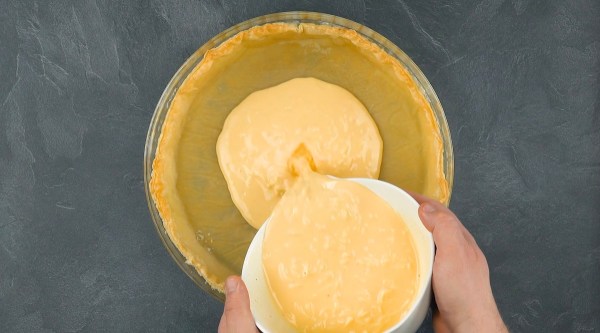 • Sortez la pâte feuilletée du four, retirez le deuxième moule et le papier sulfurisé et versez le mélange au fromage sur la pâte.