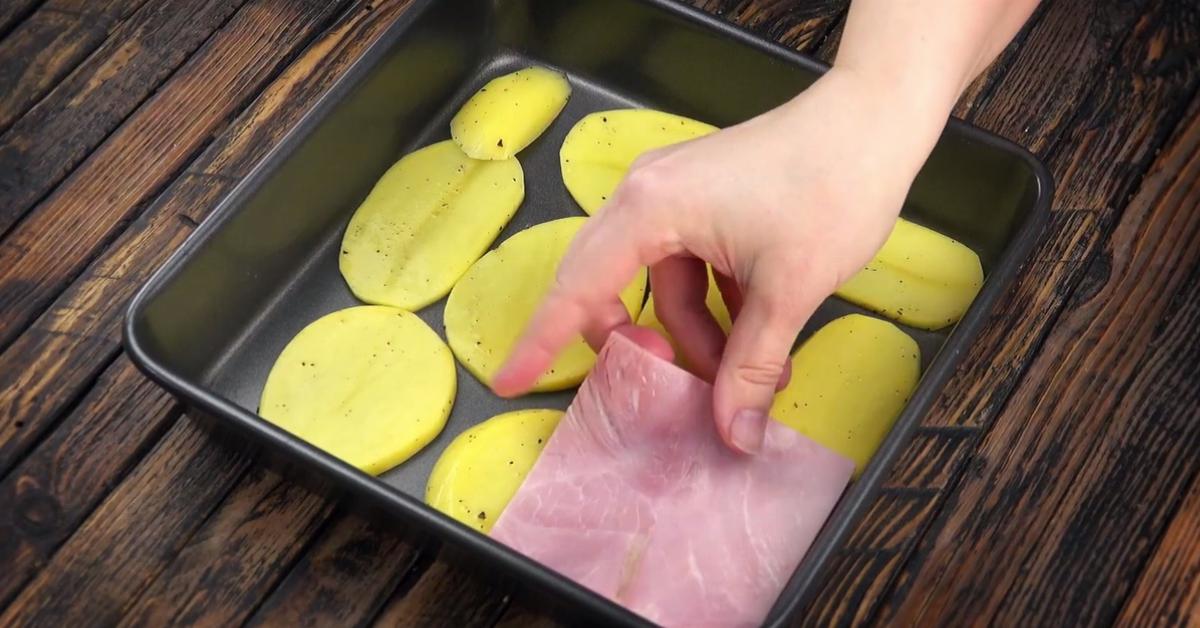 - Recouvrez le fond d’un plat carré allant au four avec une couche de tranches de pommes de terre. Recouvrez ces dernières de jambon blanc et de fromage. Répétez l’opération une seconde fois.