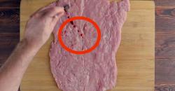 - Coupez d'abord le premier morceau de filet de porc en deux dans le sens de la longueur. Puis mettez une moitié de côté et coupez l'autre au milieu dans le sens de la longueur. Cette incision doit être assez profonde pour ouvrir la viande en deux, mais pas trop pour ne pas couper le morceau entièrement. Ouvrez la viande et utilisez un attendrisseur à viande pour aplatir le tout. Salez la surface. Répétez ces étapes avec tous les morceaux de filet de porc.