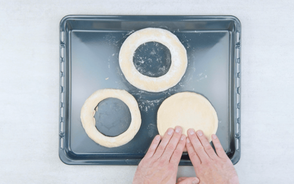• Étalez la pâte sur un plan de travail fariné et aplatissez-la pour que les gaz s'échappent. Formez ensuite une boule. Posez-la sur une plaque à pâtisserie et découpez un cercle à l'aide de l'emporte-pièce de 11 cm. Placez le morceau de pâte découpé à côté et découpez également un cercle avec l'emporte-pièce de 9 cm. Posez ce morceau à côté et aplatissez-le. Laissez lever tous les pâtons pendant 30 minutes supplémentaires à température ambiante.