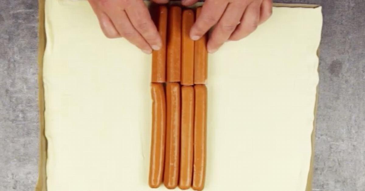 - Dépliez la pâte sur le plan de travail et alignez les saucisses sur le milieu : 4 en haut et 4 en dessous.