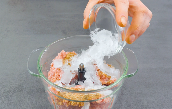 - Mettez la viande hachée avec le mélange d'épices dans un mixeur et ajoutez environ 1/3 de glace pilée. Mixez le tout pendant 30 secondes à vitesse maximale et répétez cette étape deux fois jusqu'à ce que toute la glace pilée soit utilisée. Ajoutez également le sel pour la salaison.Continuez de mixer le tout à vitesse maximale jusqu'à ce que le tout ait l'aspect d'une pâte. Important : la température de la masse ne doit pas dépasser 10 °C. Versez ensuite la viande dans une poche à douille.