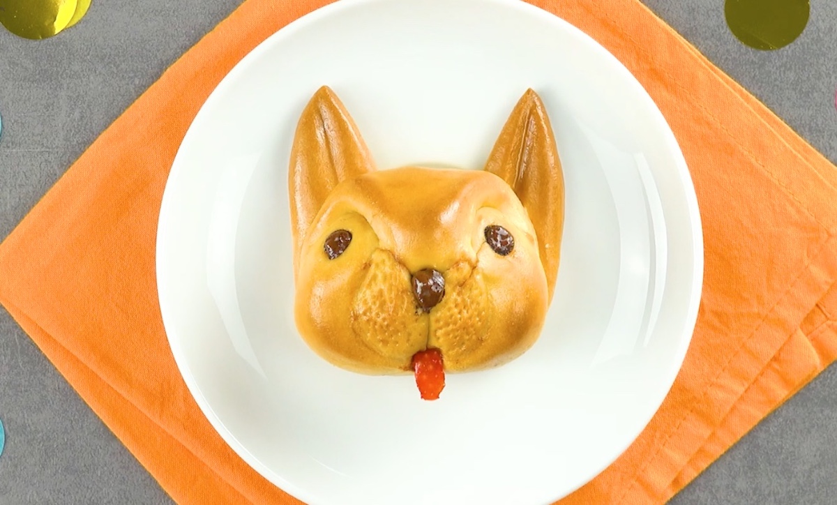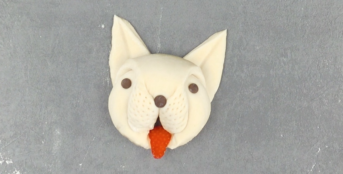 5.6 Laissez reposer le chien pendant 30 minutes, puis badigeonnez-le d’œuf battu et enfournez-le pendant 20 minutes à 180 °C.