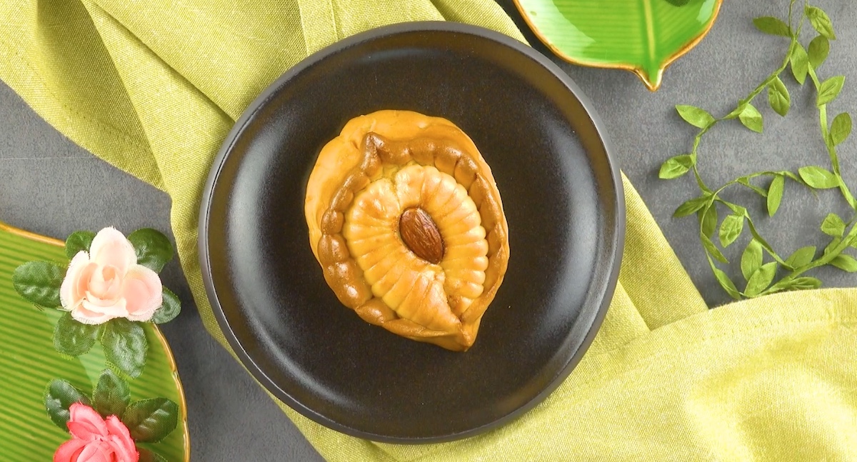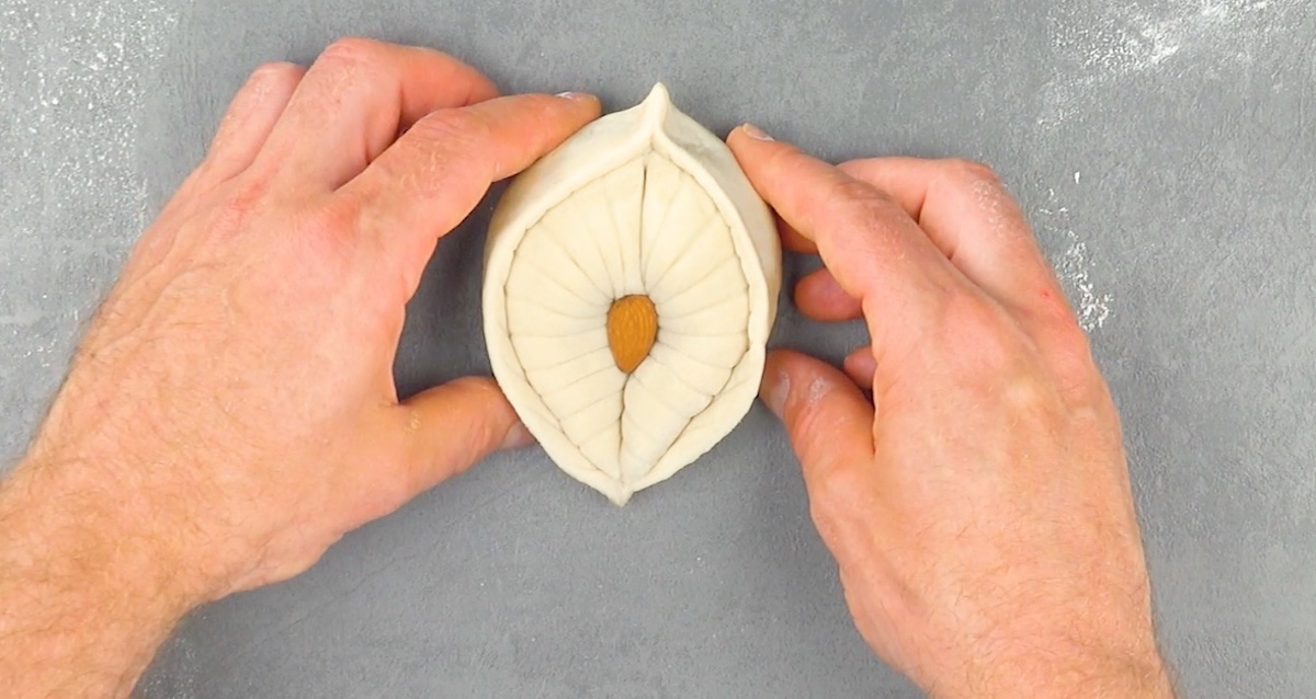 4.4 Repliez les bords, formez deux pointes et placez une amande au milieu.