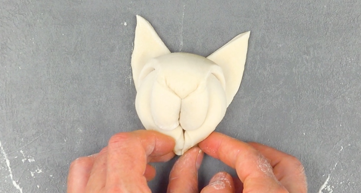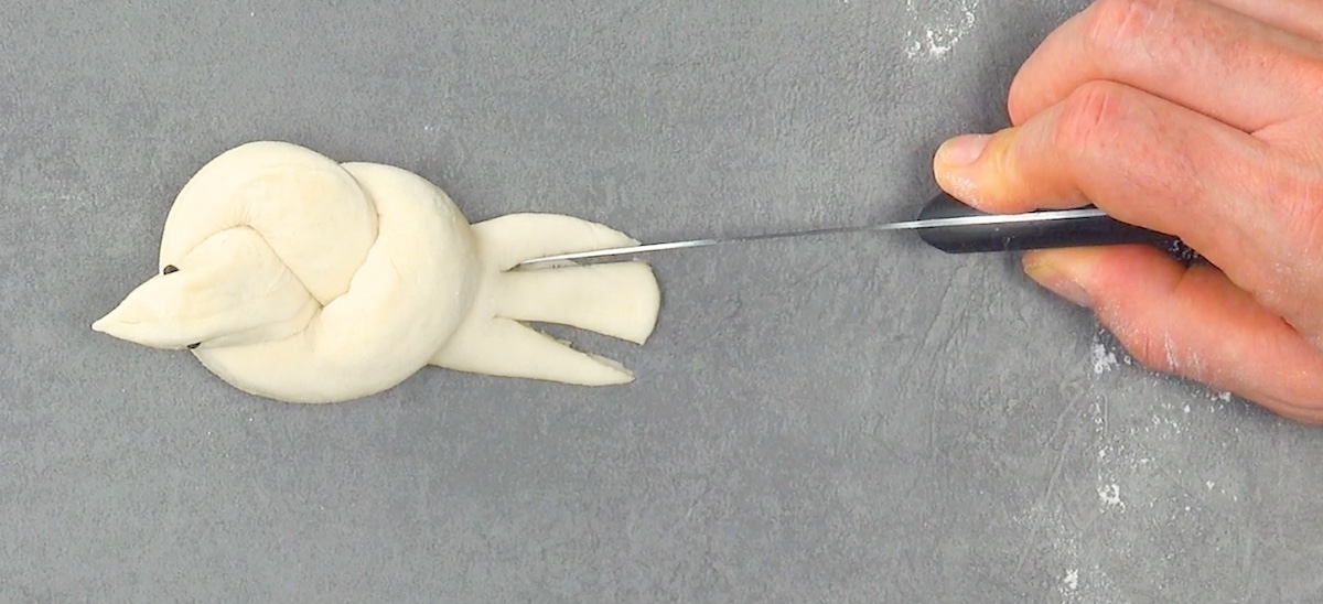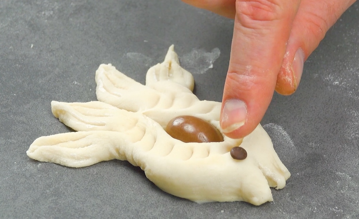3.2 Pressez les pépites de chocolat dans la pâte à brioche pour former les yeux. Aplatissez l’extrémité de la queue et coupez-la deux fois avec un couteau.