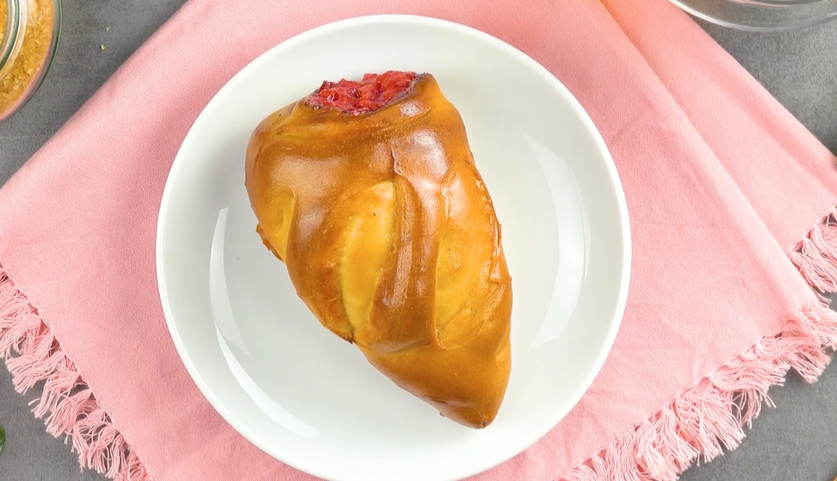 2.3 Laissez reposer le croissant aux framboises pendant 30 minutes, puis badigeonnez-le d’œuf battu et enfournez-le pendant 20 minutes à 180 °C.