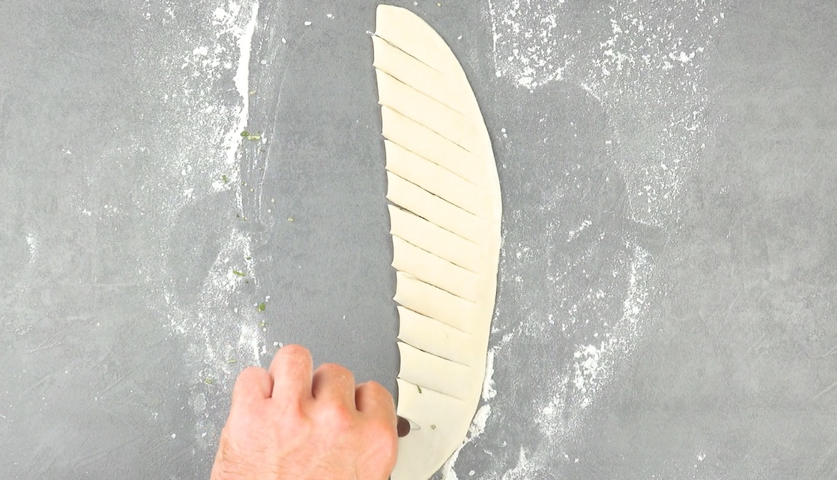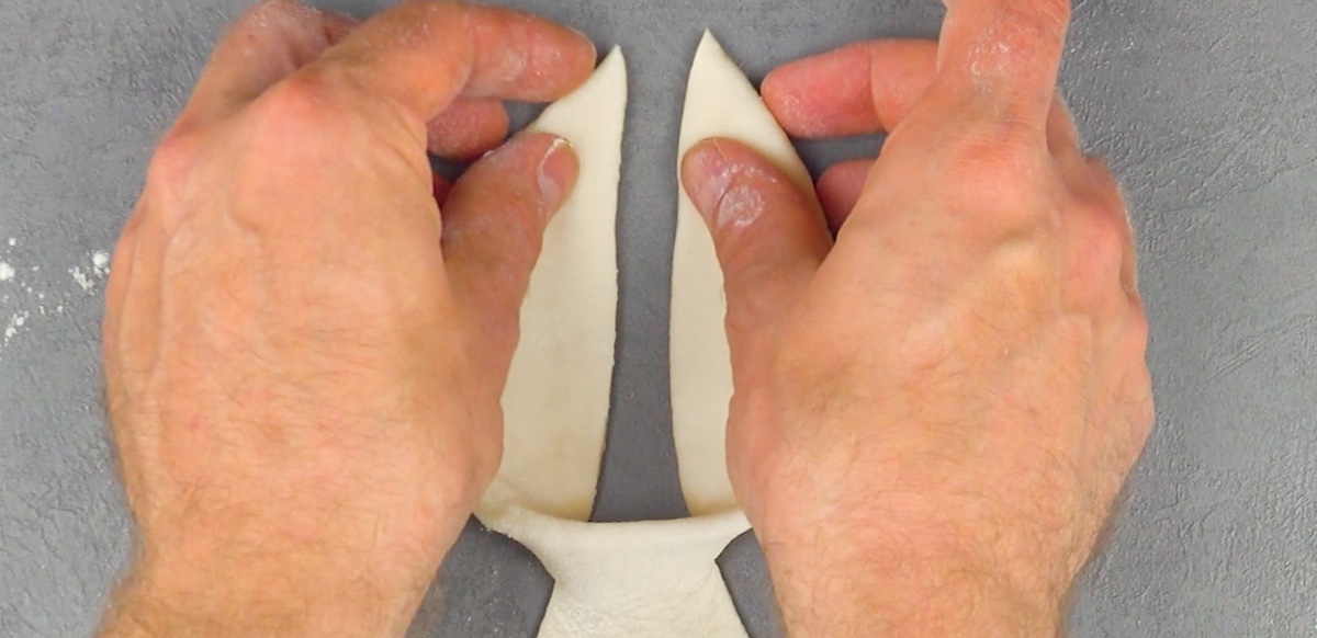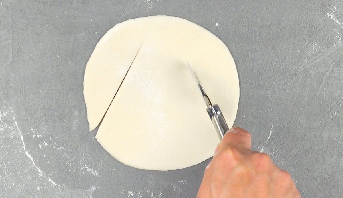 5.1 Étalez la pâte et coupez-la deux fois en diagonale.