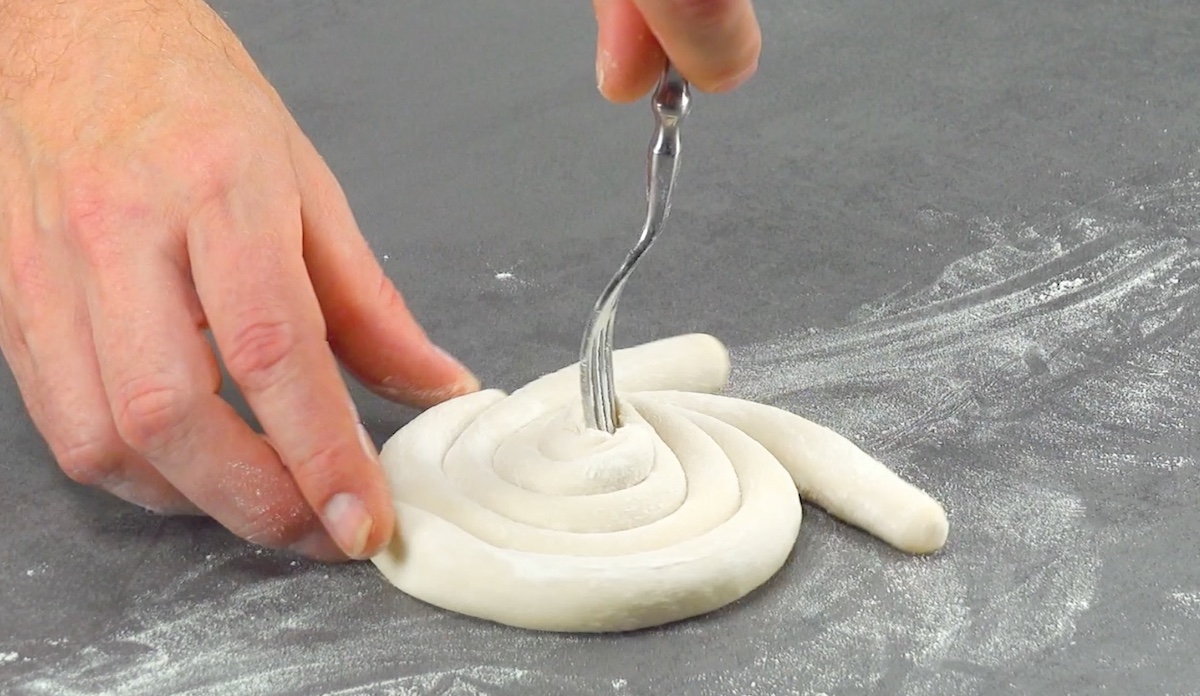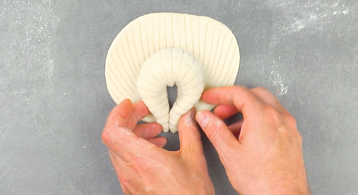 4.3 Roulez la pâte jusqu’au centre et pliez-la en forme de chenille.