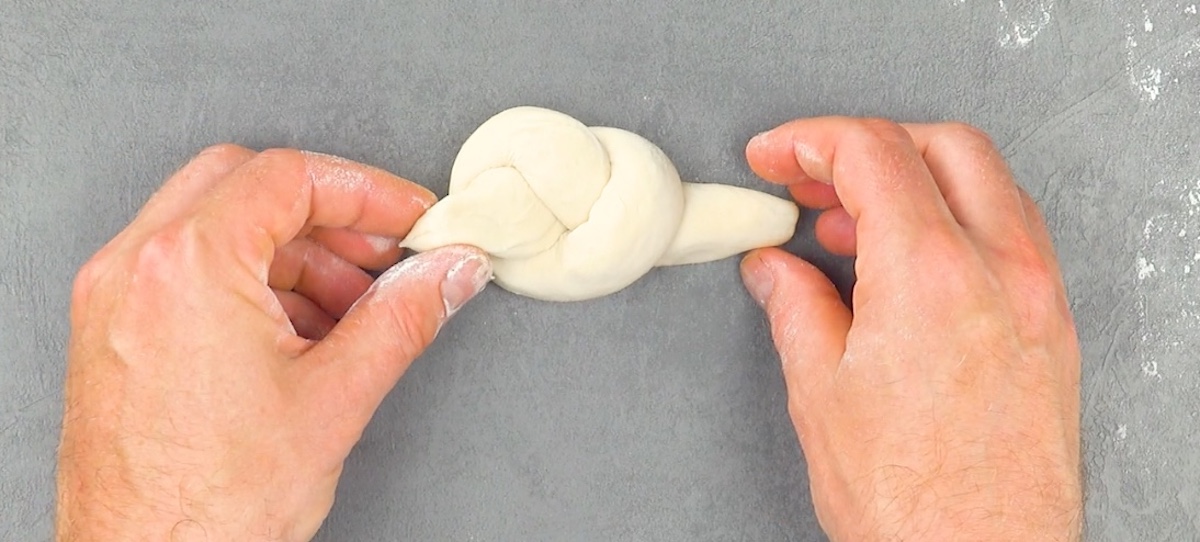 3.1 Formez un rouleau avec la pâte. Nouez le rouleau au milieu et formez un bec sur un côté.