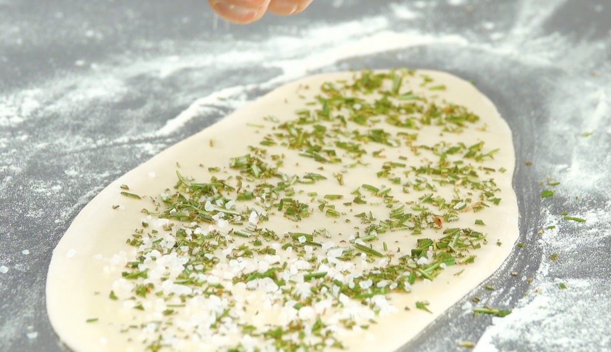 7.1 Abaissez la pâte en lui donnant une forme oblongue. Badigeonnez-la d’huile d’olive et saupoudrez-la de romarin et d’un peu de sel.