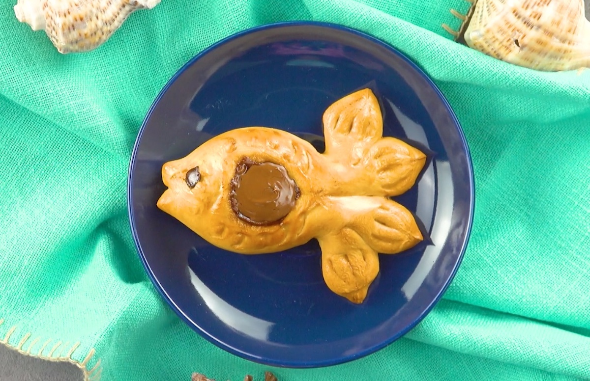 1.2 Maintenant, donnez à la pâte du côté opposé la forme d’une tête de poisson. Utilisez une cuillère pour presser un motif d’écailles dans la pâte à brioche et placez une pépite de chocolat en guise d’œil.