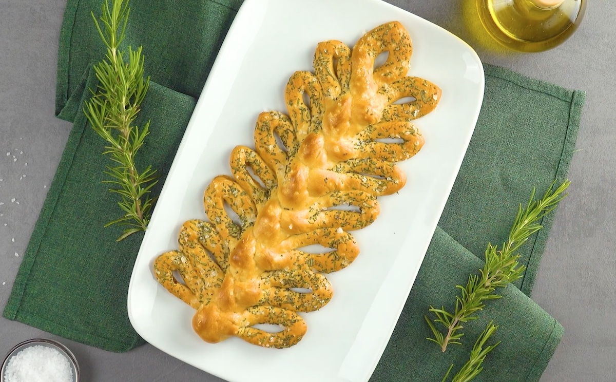 7.4 Laissez reposer la tresse au romarin pendant 30 minutes, puis badigeonnez-la d’œuf battu et enfournez-la pendant 20 minutes à 180 °C jusqu’à ce qu’elle soit dorée.