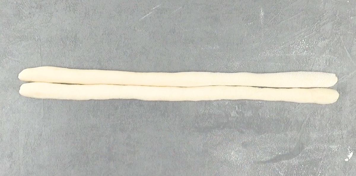 6.1 Formez deux rouleaux de taille égale à partir de la pâte à brioche. Veillez à saupoudrer les rouleaux de pâte avec suffisamment de farine pour qu’ils ne collent pas ensemble.