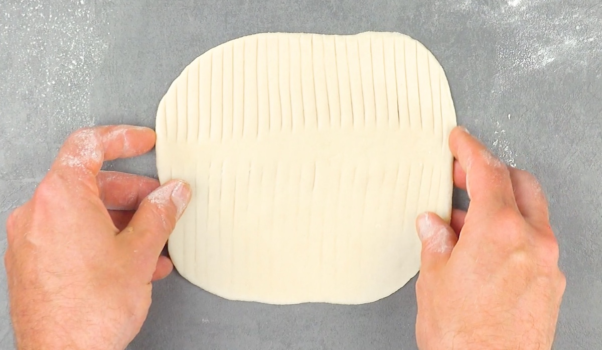 7.2 Pliez la pâte à brioche dans le sens de la longueur et entaillez-la plusieurs fois.