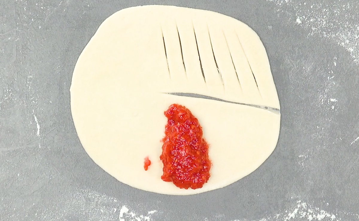 2.1 Étalez la pâte à brioche. Ensuite, coupez-le comme indiqué dans la vidéo et étalez la confiture de framboises sur le côté inférieur.