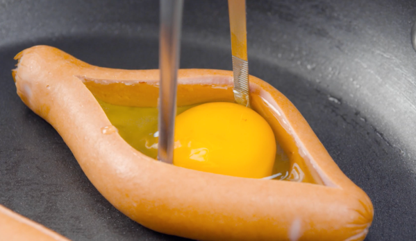 • Coupez les deux saucisses dans le sens de la longueur. Faites frire les saucisses dans une poêle huilée, en les écartant à l'aide d'une grande pince à épiler. Puis mettez un œuf au milieu de chacune d'elles (maintenez la saucisse ouverte pendant environ 30 secondes). Saupoudrez les deux œufs de parmesan et mettez un couvercle sur la casserole. Laissez les saucisses cuire pendant environ 4 minutes supplémentaires.