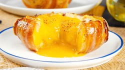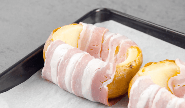 • Placez les pommes de terre sur une plaque à pâtisserie, versez un peu d'huile dessus et salez. Enfournez la plaque pendant environ 45 minutes à 160 °C. Laissez ensuite refroidir les pommes de terre, coupez les "couvercles" et creusez-les à l'aide d'une cuillère. Mélangez les pommes de terre avec le cheddar râpé. Enveloppez les pommes de terre de trois tranches de lard chacune. Remplissez ensuite les pommes de terre avec le mélange de pommes de terre et de cheddar. Ajoutez un jaune d'œuf à chaque pomme de terre. Remettez les pommes de terre farcies au four pendant 10 minutes.