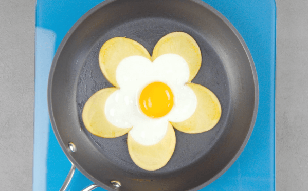 • Coupez une pomme de terre en cinq tranches d'environ 3 mm d'épaisseur. Découpez ensuite un tiers de chaque tranche. Faites frire les tranches découpées des deux côtés dans un peu d'huile et disposez-les dans la poêle pour former une fleur. Séparez un œuf et placez soigneusement le blanc entre les tranches de pommes de terre. Placez ensuite le jaune d'œuf au milieu. Battez l'autre œuf et versez-le tout autour de la fleur dans la poêle. Laissez le tout cuire pendant encore 2 à 3 minutes.