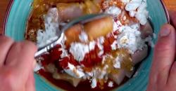 - Ouvrez le pain pita par le haut et remplissez-le d'une portion de nouilles. Ajoutez quelques morceaux de poulet, quelques cuillères à soupe de sauce au yaourt et garnissez d'oignons verts.