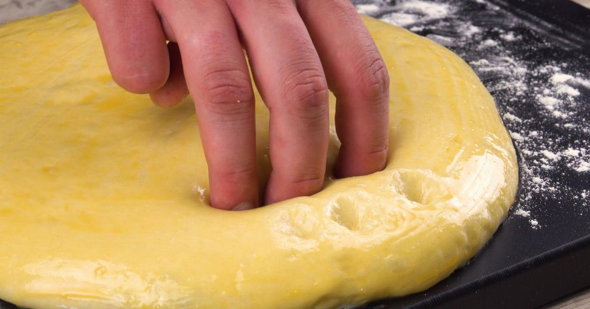 • Étalez la pâte puis enduisez-la d'un mélange de jaune d'œuf et de lait puis faites des trous à l'aide de vos doigts sur la surface. Saupoudrez le tout de graines de sésame avant d'enfourner à 190 °C pendant 25 minutes.