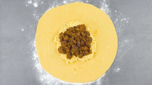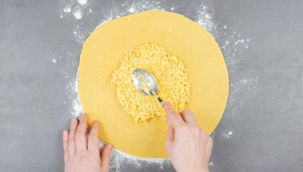 - Étalez la pâte en forme de cercle. Mélangez ensuite un œuf avec la mozzarella râpée et badigeonnez-en le milieu de la pâte.