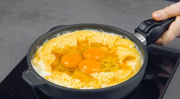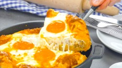 - Répartissez environ trois œufs crus dans le puits obtenu ; le nombre d'œufs peut varier en fonction de la taille de la poêle.