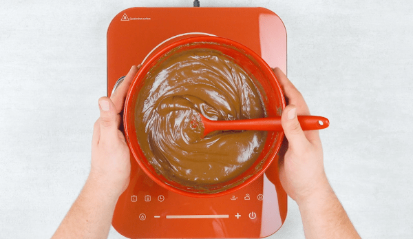 - Chauffez 85 % du chocolat à environ 43 °C (au micro-ondes), puis ajoutez les 15 % restants. Laissez refroidir à 27 °C, en remuant constamment. Ensuite, chauffez-le à 31,5 °C avec un sèche-cheveux et versez le chocolat fondu dans le moule à cake. Recouvrez l'ensemble des parois du moule et versez l'excédent de chocolat dans un saladier. Placez le moule à l'envers sur une grille et laissez le chocolat s'égoutter pendant 3 minutes. Retournez ensuite le moule. Répétez tout le processus une nouvelle fois pour que le chocolat ait la bonne consistance et la bonne épaisseur.