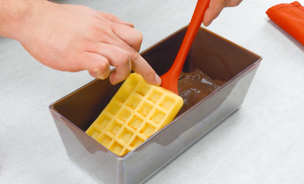 - Versez environ 3 cuillères à soupe de crème au chocolat dans le moule et étalez-la uniformément. Ensuite, placez 2 gaufres par-dessus. Répétez l'opération avec le reste des gaufres et la crème au chocolat jusqu'à ce que vous ayez environ 5 couches. Enfin, utilisez du chocolat fondu pour former la base, par-dessus la dernière couche de crème au chocolat. Laissez la base prendre.