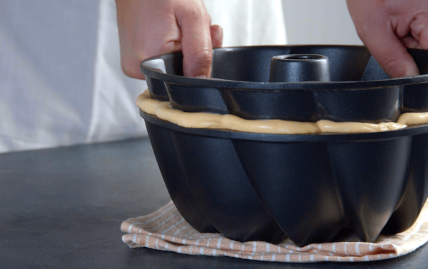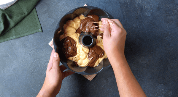 - Versez ensuite les pâtes en alternance dans un moule à kouglof graissé et mélangez légèrement avec une fourchette ou quelques bâtonnets pour donner un aspect marbré au gâteau.