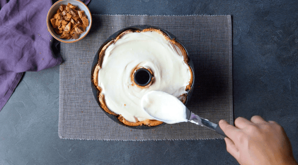 - Remplissez le creux du kouglof de crème au fromage frais jusqu'à environ un tiers de sa hauteur. Couvrez-le avec le coulis de framboises et répartissez le reste de la crème au fromage frais par-dessus.