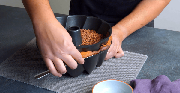- Coupez la partie du gâteau qui dépasse du bord du moule à kouglof inférieur après la cuisson et gardez les morceaux. Retirez ensuite délicatement le deuxième moule à kouglof.