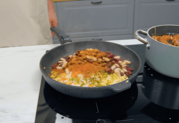 - Pendant ce temps, pour le chili, faites chauffer un peu d'huile dans une poêle et râpez-y le blanc de poulet congelé. Faites revenir la viande jusqu'à ce qu'elle soit dorée, puis ajoutez l'oignon, l'ail et le piment. Écrasez ensuite les tomates à l'aide d'un presse-purée (la peau et les pépins restent ainsi dans le presse-purée). Ajoutez les haricots et le mélange d'épices et laissez mijoter le tout à feu moyen pendant 5 à 10 minutes.