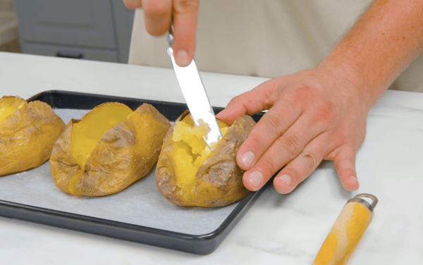 - Commencez par laver les pommes de terre. Placez-les sur une plaque recouverte de papier sulfurisé et enfournez-les à 180 °C pendant 60 minutes. Coupez ensuite les pommes de terre encore chaudes au milieu et mettez une noix de beurre dans chaque incision. Aérez un peu l'intérieur des pommes de terre avec un couteau.