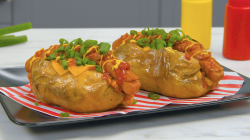 - Répartissez une tranche de cheddar, une louche de chili et une saucisse frite sur chaque pomme de terre. Ajoutez du ketchup, de la moutarde et des oignons nouveaux par-dessus.