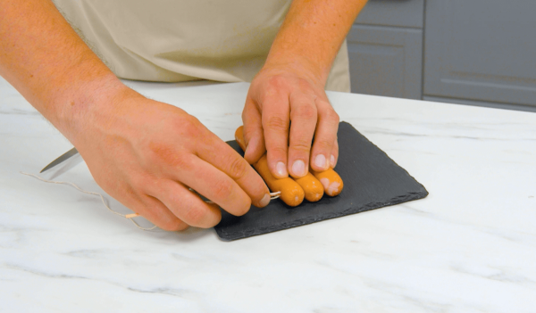 - Fixez la ficelle à une brochette en bois et percez trois saucisses placées côte à côte avec celle-ci. Enfilez la ficelle dans les saucisses et retirez la brochette de la ficelle. Écartez ensuite légèrement les saucisses.Coupez les saucisses une fois dans le sens de la longueur, mais pas complètement. Ensuite, faites plusieurs incisions en biais dans le sens de la largeur, en veillant à ne pas couper complètement les saucisses. Suspendez maintenant la chaîne de saucisses dans de l'huile chaude jusqu'à ce que les saucisses soient frites et croustillantes.