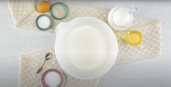 - Mélangez la farine, la levure, le sucre, le sel, 1 œuf et 1 blanc d'œuf, le lait et l'huile végétale pour la pâte.Couvrez ensuite le saladier d'un torchon et laissez la pâte levée pendant 1 heure à l'air ambiant.