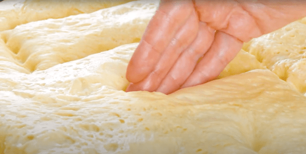 - Préparez une plaque de cuisson en y étalant du papier sulfurisé. Une fois levée, transférez la pâte sur la plaque de cuisson.Avec des doigts graissés, étalez la pâte de manière régulière sur la plaque de cuisson.Placez une autre feuille de papier sulfurisé sur la pâte et laissez-la lever pendant encore 20 minutes.