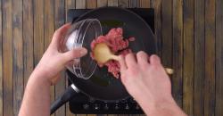 - Faites revenir la viande hachée dans une poêle avec de l'huile d'olive puis ajoutez le reste des ingrédients et laissez mijoter jusqu'à ce que la sauce s'épaississe.
