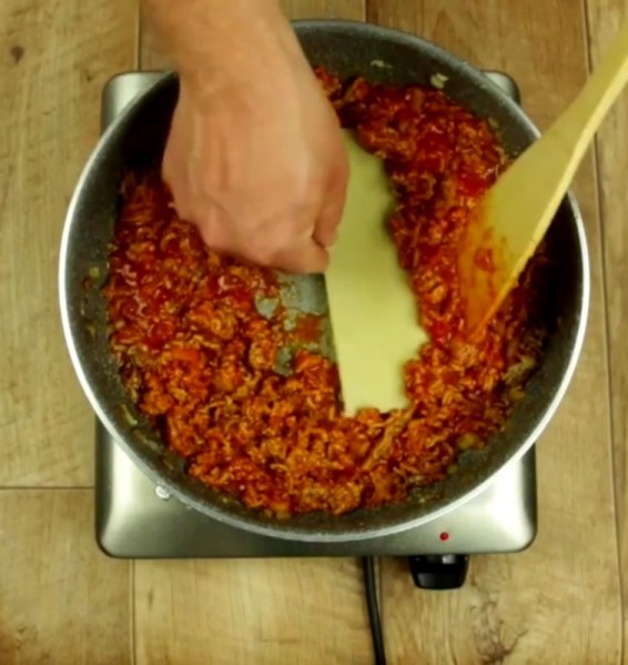 • Ajoutez maintenant 2 à 3 feuilles de Lasagne sous la viande. Ne remuez plus pour éviter qu'elles ne bougent ou cassent. Avec le reste des Lasagnes, recouvrez votre plat.