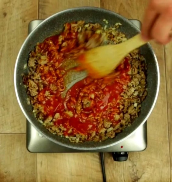 • Versez la moitié du coulis de tomates dans votre poêle et mélangez bien.