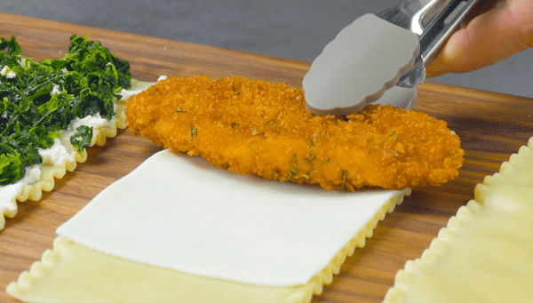 - Assaisonnez les tranches de poulet avec du sel et du poivre. Panez-les avec la chapelure, de l'œuf et des cornflakes et faites-les frire dans l'huile. Placez ensuite une tranche de fromage sur une plaque de lasagnes et le morceau de poulet pané sur le dessus. Roulez le tout et coupez les rouleaux en deux. Répétez l'opération avec 4 autres feuilles de lasagnes.