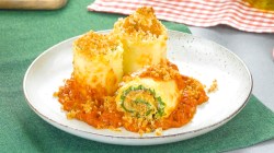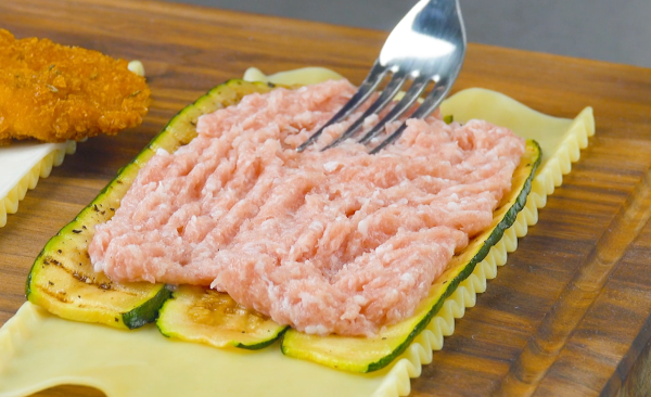 - Placez 3 tranches de courgettes grillées dans une feuille de lasagnes. Placez la chair d'une salsiccia sur le dessus et étalez-la avec une fourchette. Roulez le tout et coupez le rouleau en deux au milieu. Répétez le tout avec 4 autres feuilles de lasagnes.
