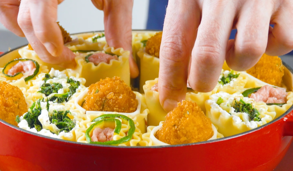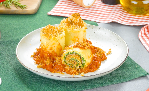 Tout le monde connaît et aime les lasagnes. Plusieurs couches de lasagnes, de la sauce bolognaise, de la sauce béchamel et beaucoup de fromage, c’est le rêve de tout amateur de cuisine italienne. Mais les lasagnes peuvent être faites d’une toute autre manière. Comme dans notre recette : des rouleaux de feuilles de lasagnes farcis avec de la ricotta, des épinards, de la salsiccia, des courgettes et du blanc de poulet sur un savoureux lit de sauce tomate. Ajoutez ensuite un peu de fromage râpé et une garniture de chapelure croustillante, et vos lasagnes très spéciales sont prêtes.