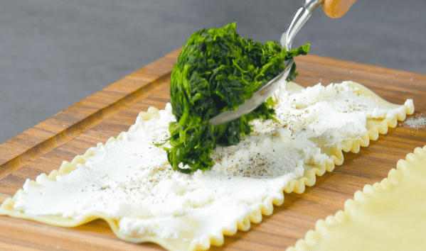 - Répartissez la ricotta sur une plaque de lasagnes et assaisonnez avec du sel et du poivre. Répartissez ensuite les feuilles d'épinards sur la ricotta et roulez le tout ensemble. Coupez les rouleaux en deux au milieu. Répétez l'opération avec 4 autres feuilles de lasagnes.