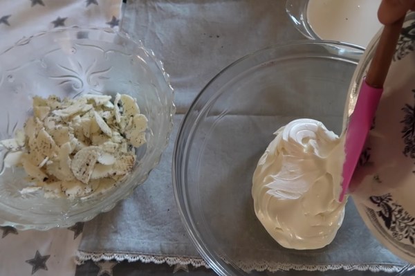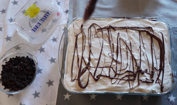 - Pour la seconde couche, versez la mascarpone dans un bol. Ajoutez la crème des Oreos et mélangez bien. Ajoutez ensuite le sucre glace. Utilisez un mixeur électrique afin d'obtenir une pâte crémeuse épaisse. Versez-y le lait. Mélangez afin d'obtenir une mixture totalement homogène. Étalez cette pâte crémeuse sur le fond de votre dessert, en répartissant bien. Saupoudrez ensuite de pépites de chocolat.