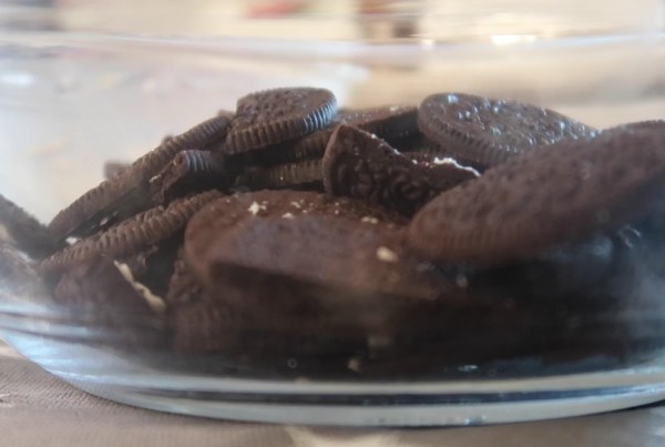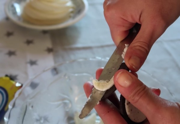 - D'abord, prenez les Oreos et à l'aide d'un couteau, grattez la crème et conservez-la dans un bol. Ensuite, étalez une serviette de cuisine propre et placez-y les biscuits en pile, au milieu. Rabattez les coins de la serviette et écrasez les biscuits avec un rouleau à pâtisserie. Il ne devrait plus y avoir de morceaux, uniquement des petites miettes. Versez-les dans un saladier.