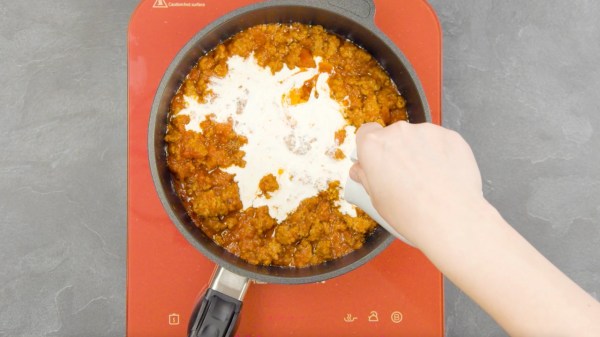 • Pour la bolognaise, faites sauter l'oignon et l'ail dans une poêle préchauffée avec de l'huile jusqu'à ce qu'ils soient translucides. Ajoutez ensuite la viande hachée et faites-la frire jusqu'à ce qu'elle soit dorée. Ajoutez le concentré de tomates, déglacez avec les tomates concassées et laissez mijoter le tout brièvement. Enfin, assaisonnez la bolognaise avec les flocons de piment, le sel et le poivre et ajoutez la crème.